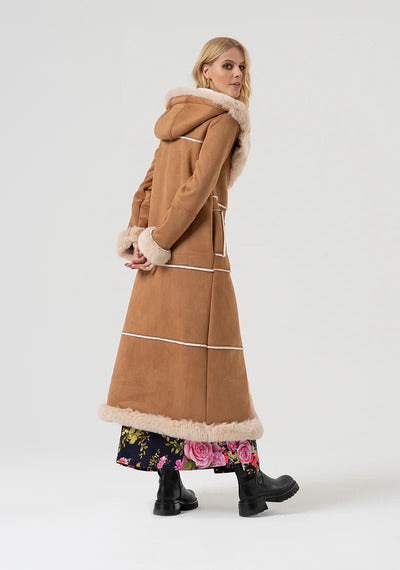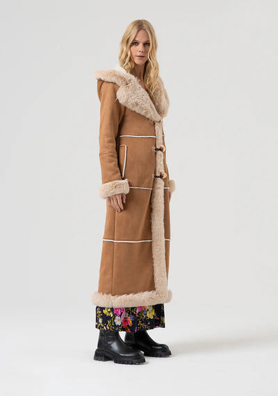 Casaco longo Montgomery Regular Fit com capuz. Detalhes em pele sintética, bolsos laterais e mangas compridas.