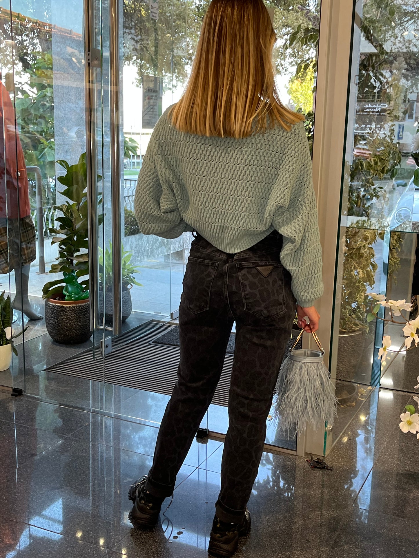 Jeans, corte regular com padrão semelhante a estampa animal.